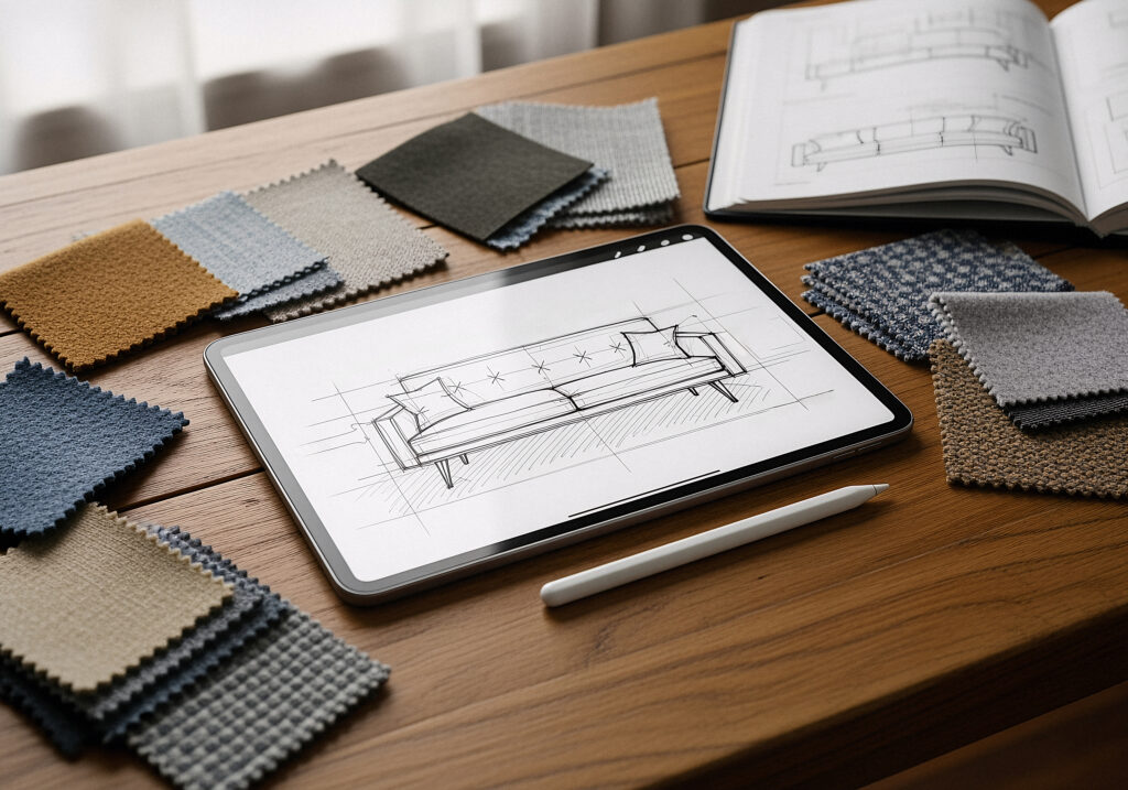 • Sélection des matériaux et finitions (bois, métal, verre, laques, etc.),